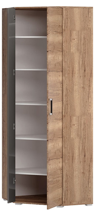 Угловой шкаф состоит из трех отдельных: одностворчатого, двустворчатого и углового. Три двери зеркальные, а одна — глухая. В комплект к корпусам идут ручки, карниз и 4 штанги для одежды. Продуманное наполнение шкафов поможет компактно и удобно расположить одежду.